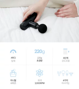 가격은 6~7만원대로 일반 저가형 마사지건보다 비싸지만 보통 가볍다고 광고하는 마사지건의 무게는 390g정도 인것을 생각하면 220g은 상당히 가벼운 편이구나를 느꼈습니다.