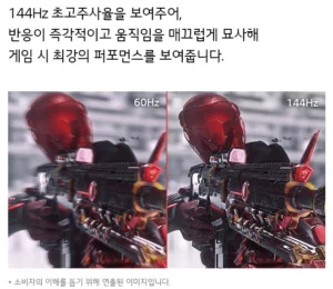 - 응답속도 1ms와 144Hz의 고 주사율로 인해 FPS 게임에서도 빠른 반응 속도를 보여준다.